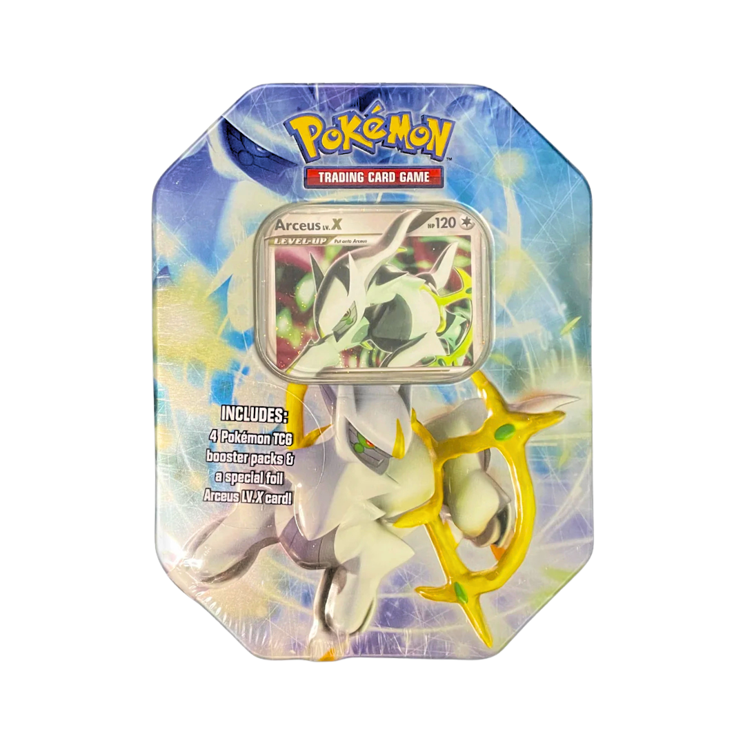 Very rare tin from 2009. Still factory sealed, it contains 4 booster packs and an exclusive Arceus Lv. X promo card.